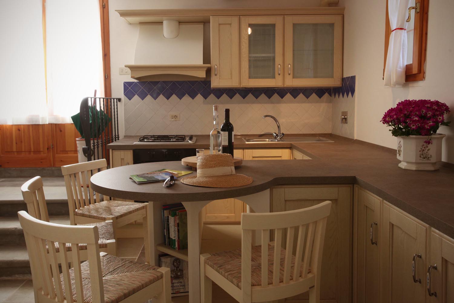 The style in the apartments is a country chic, mixing the natural architectural elements of a classical Tuscan farmhouse with modern comforts that one comes to expect while on holiday, namely a dishwasher, a laundry room and Wi-Fi hotspots. The soft pastel colors complement the rich terracotta floors, the dark wood beams and the natural light that floods the various rooms. Designed to accommodate couples and families, these apartments offer a spacious solution to your need for a home “away for home” in the heart of Tuscany.