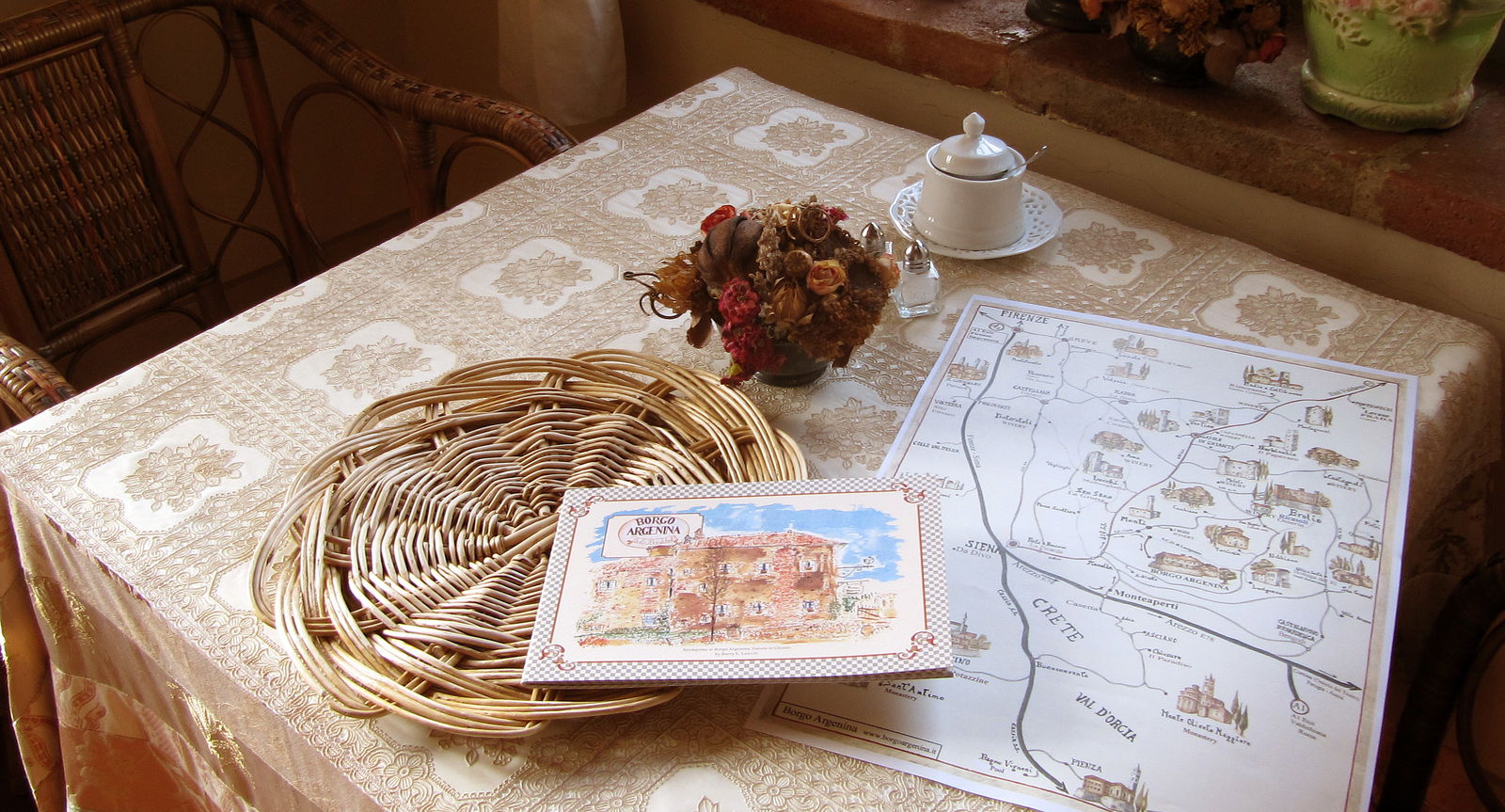 Immagino che anche gli ospiti di Borgo Argenina appena fuori Gaiole in Chianti provino la stessa sensazione quando scendono nella sala delle colazioni e sentono il suono delle risate ed il parlare concitato degli ospiti. Ed è ovvio che Elena non solo ami preparare un'abbondante colazione a buffet, ma adori anche adornare i tavoli e l'ambiente (sarà forse per via della sua trascorsa esperienza come modella?), oltre che riuscire a far star bene insieme le persone. Sono stata accolta da uno dei suoi cagnolini, che sono stata molto tentata di attirare nella mia macchina per portarlo a casa con me! Affettuosi ma non troppo invadenti ed impiccioni, i due amici a quattro zampe di Elena la seguono silenziosamente ovunque, sperando che magari possa cascare quasi casualmente qualcosa da mangiare anche per loro!