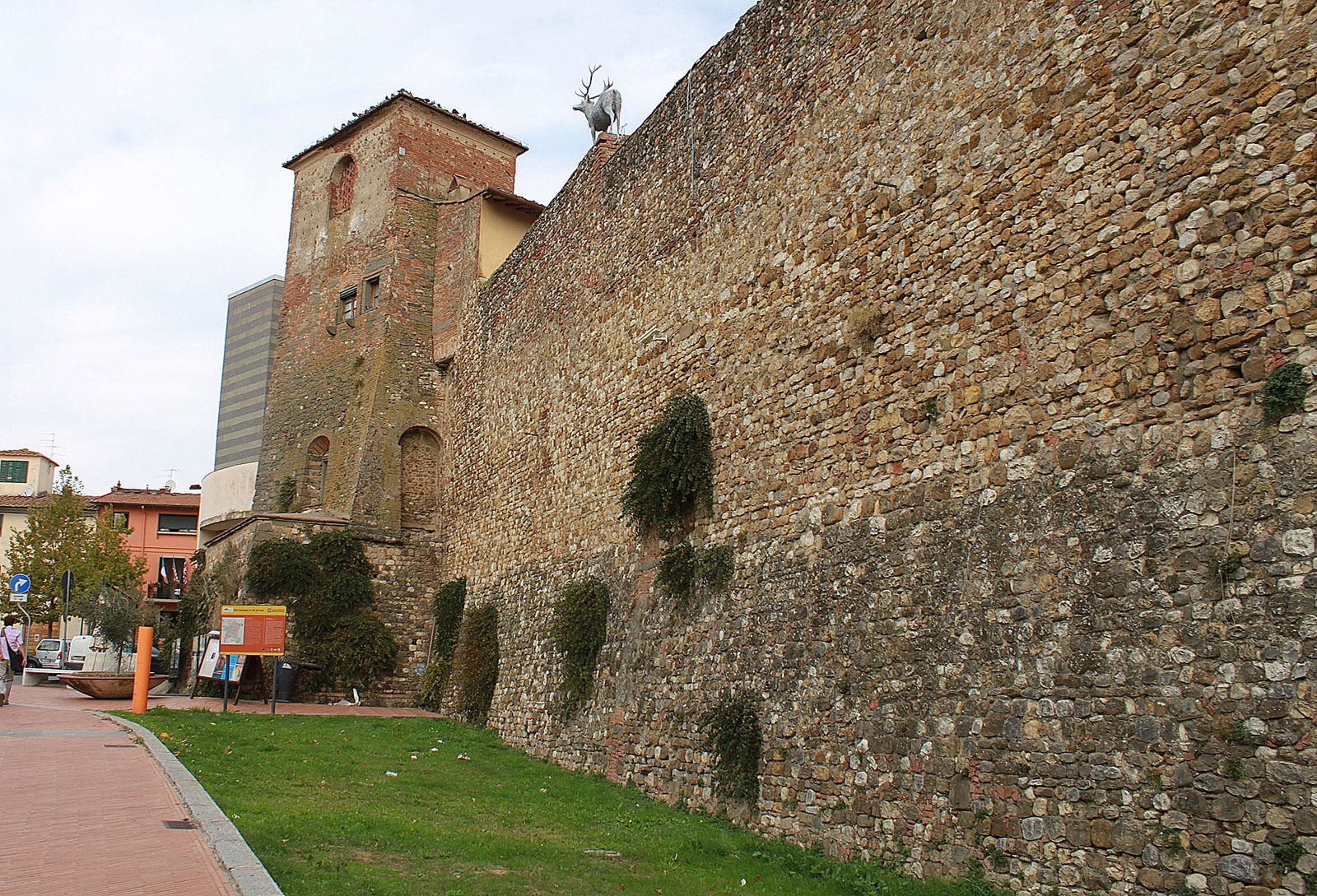 San Casciano has dedicated time and resources to create real sidewalks throughout the little town, making it truly a pleasure to walk around and explore. The city walls are parallel with a wide sidewalk where with a leisurely stroll around, you can soak up some of that great Chianti weather and admire the massive city walls. The walls built in mid 1300’s measured 7 meters tall and over 1200 meters in length with two principal gates in the direction of Florence and Siena and two minor gates in the direction of Empoli and a "prato" (a large grassy field). Throughout the city and its streets, parks and cafes you will notice that the architects have managed to mix modern art accents almost seamlessly with the antique structures. A prime example is the statue of a stag (by artist Mario Merz) walking along the top of the antique city walls.